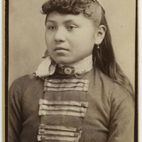 A portrait of an unidentified Native American girl. She probably attended Chemawa School and/or the Indian Training School at Forest Grove. The photograph is a small, 85mm x 185mm image in carte-de-visite format. Although the photographer is not identified on the photograph, it matches other carte-de-visite photographs in this collection by W. P. Johnson of Salem that are dated. It was probably taken between 1886-1888 (Robinson, Oregon Photographers, 1993, p. 394).