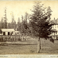 An image of the Indian Training School's original campus in Forest Grove. It shows the students in their uniforms, a male teacher (probably the superintendent, Captain M.C. Wilkinson), and other teachers and staff in the foreground, with a dormitory (right), workshop (center) and another dormitory (left) in the background. The caption describes the image: 'One of the main buildings, erected entirely by Indian boys; dormer windows, rustic painting on all. Their work without aid.' It is numbered 36 in a series of photographs by I.G. Davidson, a photography studio based in Portland. The series shows how the school taught the children to behave according to the norms of white society, including learning trades and wearing Western clothing. It was probably taken in 1881 or 1882, based on other dated photographs within the series.