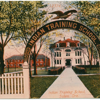 A hand-tinted photograph of the entrance arch to Chemawa Indian School in Salem, lettered 'Indian Training School.' It depicts Chemawa as it appeared in 1905. The Pacific University Archives' copy of this photograph is a reprint made in the late 20th century. The original photograph was likely issued as a postcard.