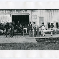 A posed photograph taken in 1881 of Native American boys in the Forest Grove Indian Training School performing blacksmithing (left) and carpentry skills (right). The names of the children are not identified. The white man is their blacksmithing instructor, William S. Hudson. The building in the background is the school’s workshop, which was on the main campus of the school in Forest Grove. The caption notes that this was number 33 in a series of photographs by I.G. Davidson, a photography studio based in Portland. The series shows how the school taught the children to behave according to the norms of white society, including the teaching of vocational skills such as this one. This photograph was reproduced alongside several other images of the school as an etching in a popular magazine, Harper's Weekly, in 1882. The Pacific University Archives' copy of this photo is a black-and-white reproduction of the original, which would have been a sepia-toned albumen print.