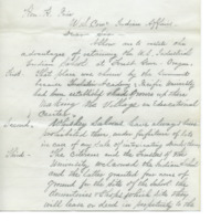 A letter dated May 26, 1884 regarding reasons to keep the Indian School in Forest Grove, Oregon. The letter is from George H. Atkinson, Secretary of the Board of Trustees of Pacific University, to H. Price, Commissioner for Indian Affairs within United States Department of the Interior. Atkinson provides twelve reasons for keeping the school open in Forest Grove rather than closing or moving it to a new location. His reason include positive conditions in the town of Forest Grove, academic and vocational successes of the students, happiness of the students' parents with the school, moral qualities of the school and advantages to the land chosen for its farm.