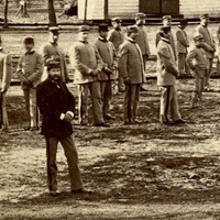 A detail from a larger image of the Forest Grove Indian Training School Campus, focusing on the school's first superintendent, Melville C. Wilkinson. At the time this photograph was taken, Wilkinson was an officer in the United States Army who had been given a special assignment allowing him to serve as superintendent of this school. In this view, he is wearing his military uniform and is standing in front of boys from the Forest Grove Indian School. They are standing on the Forest Grove Indian School campus. It is from a photograph originally captioned, "Indian Training School, Forest Grove, Oregon." The original is numbered 36 in a series of photographs by I.G. Davidson, a photography studio based in Portland. The series shows how the school taught the children to behave according to the norms of white society, including learning trades and wearing Western clothing. It was probably taken in 1881 or 1882, based on other dated photographs within the series. See the original photograph, PUApic_008607, in the Forest Grove Indian Training School Collection, Pacific University Archives.