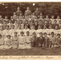 A group portrait of 62 Native American students from Pacific Northwest tribes who were enrolled at the Forest Grove Indian School. It was likely taken between May-June 1881, by which time a total of 64 students had enrolled.
