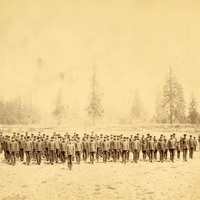 A group portrait of the boys enrolled at Chemawa Indian School, very soon after the school relocated there from Forest Grove in 1885. The boys stand at attention, demonstrating a military drill for the camera. The student standing in front of the others may have been leading the drill. One student holds the United States flag aloft on the right. A woman stands in the doorway of the white building on the left. Trees, which had not yet been cleared from the campus, lie behind a fenced area in the background. The boys in this portrait were taken to the school from tribes across the Pacific Northwest as part of a government plan to force them to assimilate into white culture. For another photograph taken on the same day, see image WCMss261_001_176.