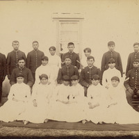 A group portrait of the 1885 graduates of the Forest Grove Indian School. The school relocated from Forest Grove to Chemawa that year and was renamed soon afterwards. This image was probably made at Chemawa based on the white building in the background. It was probably taken at the end of the school year in June. The boys wear their military-style school dress uniforms; several have stripes, epaulets and medals that probably indicated their ranks within the school. The girls wear matching white dresses which the girls probably sewed in the school's sewing workshops. Two students have been identified: James Stewart, Nez Perce (middle row, fourth from right); and Jacob Helm, Paiute of Yakama (middle row, second from left). Emma Kahama may be the fourth student from the right in the top row. Students listed in school records as 1885 graduates, many of whom are probably in this portrait, include: John Alexis, Lummi; George Blake, Stikine Tlingit; David Fletcher and Jennie Fletcher, Snohomish; Jacob Helm, Paiute of Yakama; Etta Hollaquilla, Warm Springs; Thomas Itwis, Puyallup; Levi Jonas, Nez Perce; Emma Kahama, Puyallup; Peter Kalama, Nisqually and Hawaiian; Ella Lane, Puyallup; William Lewis, Tlingit; William Martin, Puyallup; George Meacham, Wasco; Lizzie Olney, Warm Springs; Emma Parker, Wasco and Warm Springs; Lillie Pitt and Sallie Pitt, Pit River and Warm Springs; Rosa Price, Nez Perce; Peter Sherwood, Squaxin Island; John Smith, Skokomish; James Stewart, Nez Perce; Susie Winyer, Nisqually.