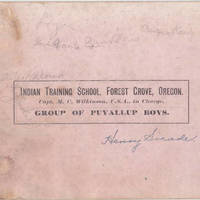 The back appears to be signed by Henry Sicade, who was one of the most successful former students of the school. This copy is water-damaged. This portrait was taken on the grounds of the Forest Grove Indian School by a photographer from the I.G. Davidson Studio, whose office was in Portland. It is part of a series of photographs of the school that were shot, sold and distributed by the Davidson Studio, with a portion of the sales going to support the school.