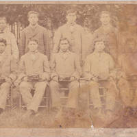 An outdoor portrait taken in 1881 or 1882 of twelve male students from the Puyallup tribal agency who were attending the Forest Grove Indian School. Those pictured appear to be from the first group of students from Puyallup who were admitted to the school on February 25, 1880. Notes penciled on the back of the photograph identify several of them as: Augustus Kautz; Nugen Kautz; David Brewer; Henry Sicade; Peter Kalama; and Jerry Meeker. The Kautz brothers are the two standing in the back row, wearing similar darker-colored suits. A descendant has also identified Samuel "Spott" McCaw as the student sitting furthest left on the bottom row.