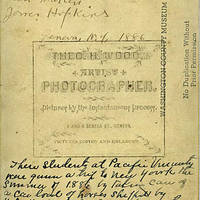 [Front] [stamped] Theo. H. Wood = Geneva, N. Y. [Back] [ink] Albert Tozier; Henry Sicade, Ben Martin, James Hopkins. Geneva, NY, 1886. These students at Pacific University were given a trip to New York the summer of 1886 by taking care of a car load of horses shipped W. D. Baxter. The horses from the bunch grass country near Yakima. [sic] These boys had the time of the their lives. [stamped] Theo. H. Wood, Artist, Photographer. Pictures by Instaneous Process. 4 and 6 Seneca St., Geneva. Pictures copies and enlarged.