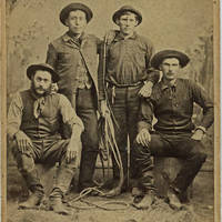 Four men dressed as cowboys, identified on the back of the photograph from left-to-right as: Albert Tozier, Henry Sicade, Ben Martin, and James Hopkins. Sicade was a notable member of the Puyallup Tribe. He entered the Forest Grove Indian School in 1880 before enrolling in regular high school classes at Tualatin Academy nearby around 1883. Later in life, he went on to found an integrated public school system in Fife, WA, near the Puyallup Reservation. Albert Tozier was also notable: He later became the editor of several newspapers in Washington County, Oregon. At the time that this photograph was created, the four young men had taken on work as cowboys and traveled together across the country. This studio portrait was made in Geneva, New York, in 1886.