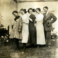 - A black and white photograph of Ruth Haines with a group of friends. This photograph is part of the Nettie Shipley Haines photograph album.