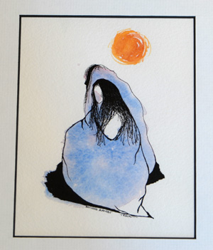 - Woman covered in a blue blanket with a figure behind her and an orange sun.