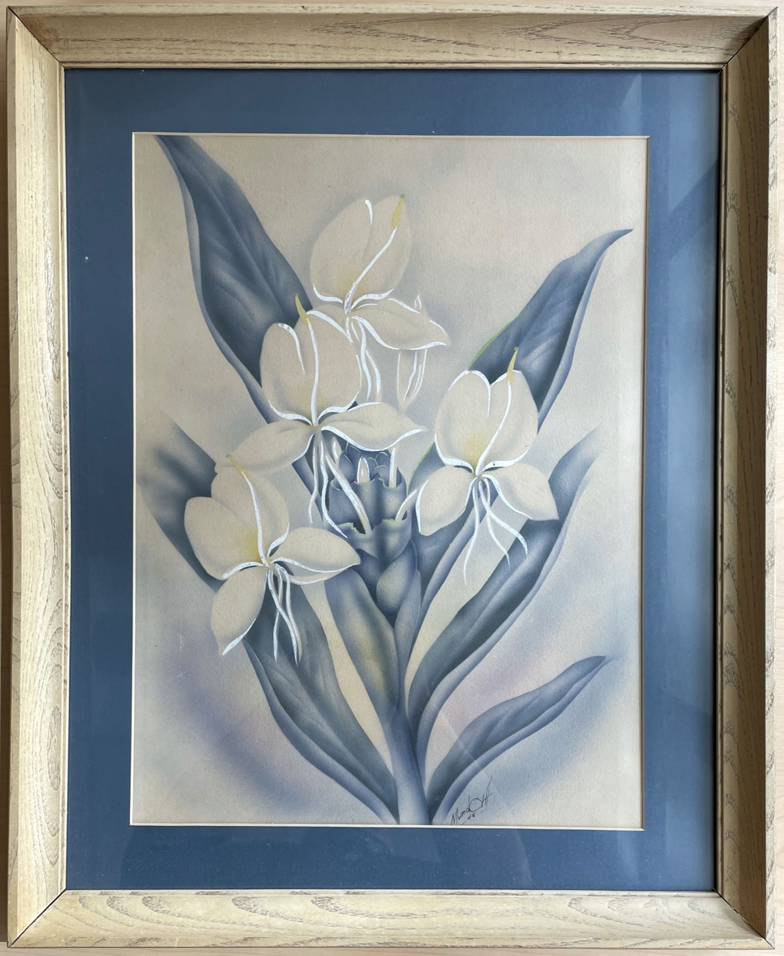 - Airbrushed watercolor on paper depicting four pale orchids. Framed.