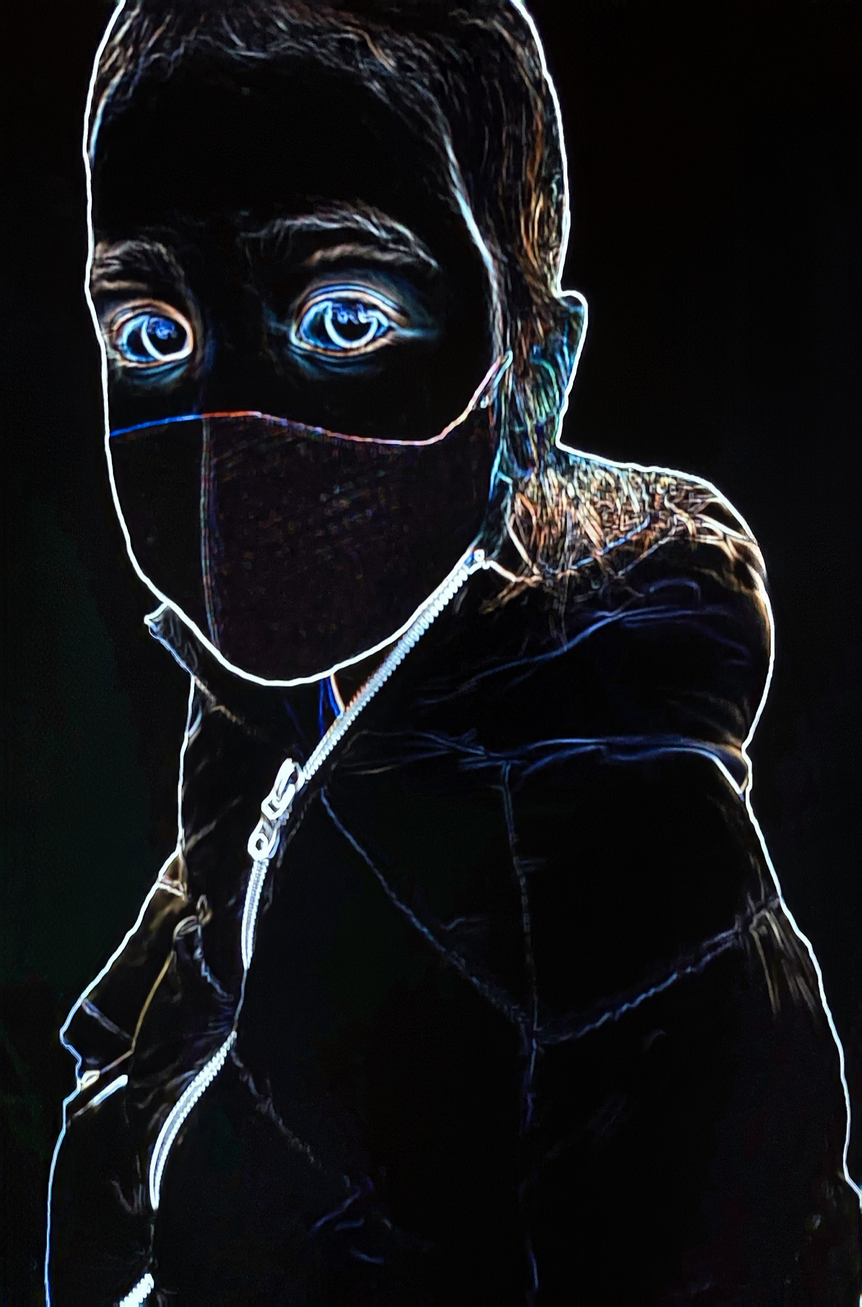 - A mounted, abstract mixed media piece depicting a person wearing a mask and a zip-up hoodie.