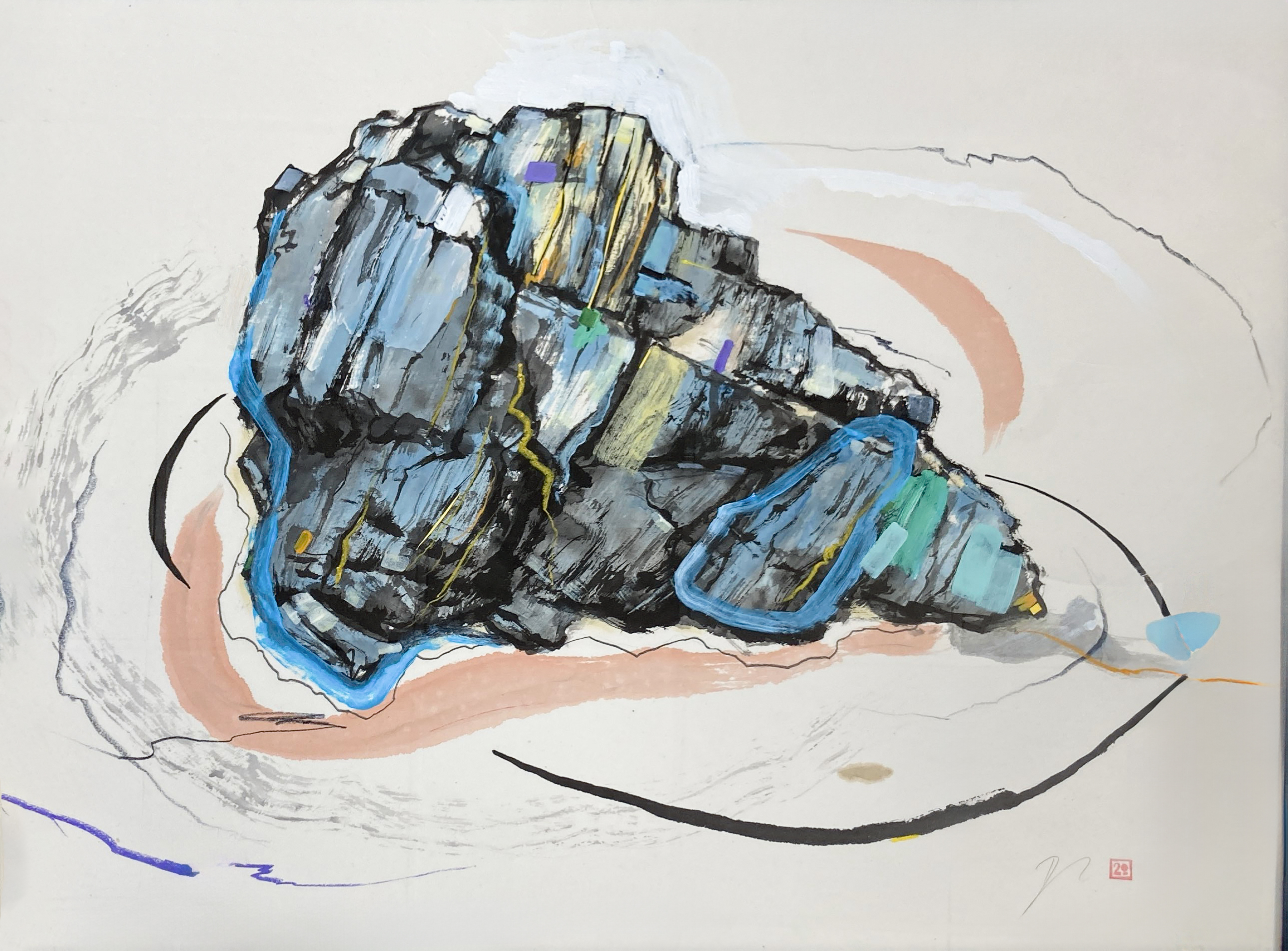 - An abstract, mixed media depiction of a blue rock. Swash Series. Acrylic and ink on rice paper. Created by Doug Anderson, professor, Pacific Univeristy Art Department.