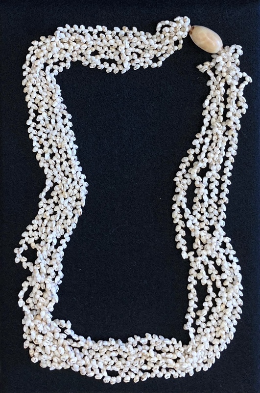 A 6-strand Ni'ihau shell lei with a large shell clasp likely created between 1900 and 1960. According to Ni'ihau Cultural Heritage Foundation, the term 'Ni'ihau shell' legally refers only to shells gathered on the shores of the Forbidden Island, or Ni'ihau in Hawaii. Access to this island is highly restricted to preserve its unique culture and environment, making this style of lei both culturally significant and highly valuable.