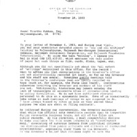 Letter to Swami Prartho Subhan, attorney for Bhagwan Shree Rajneesh from Bob Oliver, Legal Counsel to Governor Atiyeh. Oliver responds to their request under public records laws for access to all of the Governor's files and written information involving the Rajneesh. Oliver denies the release of these documents, including a list of memoranda between himself and Governor Atiyeh, citing various laws that protect them. This item was a part of the papers of Bob Oliver, Governor Atiyeh's legal counsel.