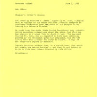 Memo from to Governor Atiyeh from Bob Oliver, his legal counsel, regarding the Bhagwan Shree Rajneesh's driver's license. An attached letter signed by Ms. Doan alleged that an employee of the Motor Vehicles Divisions may have been bribed into issuing a license to Bhagwan. According to Captain Brickeen, the police department does not intend to pursue the accusation further due to it being based in speculation. This item was a part of the papers of Bob Oliver, Governor Atiyeh's legal counsel.