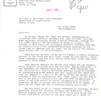 Letter from Police Major K. L. Lamkin to John C. Williams, the Superintendent of the Oregon State Police department. The letter reports on an invited visit he made to Rajeeshpuram with other police officers and District Attorney in order to discuss safety and security issues relating to a planned Rajneesh Festival in July. Representatives from the Rajneesh Foundation, Sheila Fisher, John Shelfer and Sheela Silverman, explained the plans for transportation and housing for festival participants. Lamkin explains that there would not be patrols on the roads unless it became necessary, however, the department anticipated an increase in confrontations between individuals from the commune and residents in the area. This item was a part of the papers of Bob Oliver, Governor Atiyeh's legal counsel.