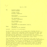A memorandum to various Oregon government departments from the legal counsel to Governor Atiyeh, Bob Oliver. He covers updates regarding the Festival of Enlightenment to be held at Big Muddy Ranch by the Rajneesh. He predicts that the Rajneesh's estimation as to attendees has been inflated. Oliver further requests a meeting with the members of these departments including; the Health Division, Military Department, Department of Transportation, Executive Department, Oregon State Police, and the Department of Environmental Quality. The purpose of the meeting would be to determine any other potential incidents that could occur or where current public policy may be lacking. This item was a part of the papers of Bob Oliver.