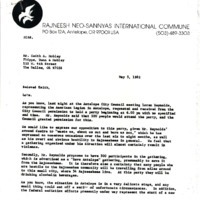 Letter from Swami Krisha Deva, also known as David Knapp, to Antelope city attorney Keith A. Mobley. On behalf of the Rajneesh living within the county, he expresses the foundation's opposition to a party being held by Loren Reynolds, a local person who had previously shown hostility towards the Rajneesh. The Rajneesh ask that the party be reconsidered to prevent potentially violent incidents from occurring. This item was a part of the papers of Bob Oliver, Governor Atiyeh's legal counsel.