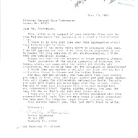 Letter from Martha Stranahan, a journalist from Redmond, to Oregon Attorney General Dave Frohnmayer explaining her support for his suit filed to prevent the community of Rajneeshpuram from operating as an incorporated city. She also expresses her dislike for the Rajneesh and belief that they pose a threat. This item was a part of the papers of Bob Oliver, Governor Atiyeh's legal counsel.
