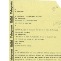 Telegram from Na Yoga Didya, President of the Rajneesh Neo-Sannyasin International Commune, to Governor Atiyeh. The telegram explains the shock the Rajneesh community experienced upon discovery of the Governor's involvement in the case against them. The case, filed by Oregon Attorney General Dave Frohnmayer, was an attempt to prevent the community of Rajneeshpuram from incorporating as a city. This item was a part of the papers of Bob Oliver, Governor Atiyeh's legal counsel.