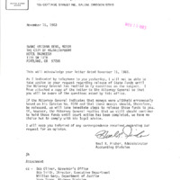 A letter from Neal R. Fisher of the Oregon Executive Department's Accounting Division to Swami Krishna Deva, the Mayor of Rajneeshpuram. He responds to Rajneeshpuram's request regarding state funds, explaining that no state funds can be released until his office receives a reply from the Attorney General. Also included is a letter from Fisher to Attorney General Dave Frohnmayer inquiring as to whether or not various agencies should continue to withhold distributions of funds to the city of Rajneeshpuram. This item was a part of the papers of Bob Oliver, Governor Atiyeh's legal counsel.
