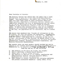 Letter from Swami Prartho Subhan, who represents himself as an attorney for the community of Rajneeshpuram, to the custodian of records in the Oregon Governor's office. Subhan argues that precedents set in previous cases have mandated access to government records. He requests all writings and records dealing with the Rajneesh to be produced. This item was a part of the papers of Bob Oliver, Governor Atiyeh's legal counsel.