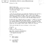 Letter from Jess Armas, an Administrator within the Oregon Children's Services Division, to Swami Krishna Deva, the mayor of Rajneeshpuram. The letter informs the mayor that after review, the Children's Services Division staff determined that the childcare facility within the community did not require licensing as a private agency, as long as the current state of care is not subject to change. This item was a part of the papers of Bob Oliver, Governor Atiyeh's legal counsel.