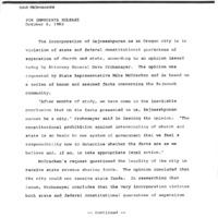 A press release and legal opinion from the office of Oregon Attorney General Dave Frohnmayer concerning the incorporation of Rajneeshpuram as a city. Frohnmayer is quoted as saying that Rajneeshpuram cannot be incorporated because the community was 'a total fusion of government and of religious functions,' and as such would violate the constitutional principle of separation of church and state. The press release is followed by the text of Frohnmayer's legal opinion. This item was a part of the papers of Bob Oliver, Governor Atiyeh's legal counsel.