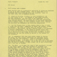 A memo from Gerry Thompson, chief of staff for Governor Atiyeh to Bob Oliver, the Governor's legal counsel, responding to a recent meeting with an anti-Rajneesh group. The group is unnamed, but may have been the 1000 Friends of Oregon. The memo provides replies to several of the group's questions and attempts to dispel rumors circulating within the community. She notes that the group has so far failed to specific proof of illegal activity by the Rajneesh. However, after the consideration of comments made during the meeting about potential violations of Oregon state law, it had been determined that an inventory needs to be taken of all agencies involved. This item was a part of the papers of Bob Oliver, Governor Atiyeh's legal counsel.