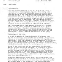 Memo to Governor Atiyeh from Bob Oliver, his legal counsel. Oliver writes to the Governor after a weekend visit to the city of Rajneeshpuram. He describes the atmosphere of the Ashram and the community. Further into the letter, Bob Oliver deliberates on the social classes and hierarchy existing within the city as well as the overall demeanor of the citizens. He states that he does not believe that there is any reason to be concerned about potential violence occurring on behalf of the Rajneesh. This item was a part of the papers of Bob Oliver.