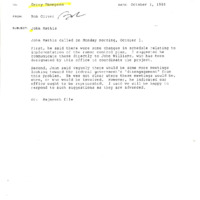 Memo from Bob Oliver, Governor Atiyeh's legal counsel, to Gerry Thompson, the governor's chief of staff. Bob Oliver writes an account of a phone call he received from John Mathis, who was a part of the Rajneesh department of community relations in Seattle. The conversation covered updates for a rumor-control network and a need for a representative from the Governor's office to be present at future meetings about the federal government's 'disengagement'. This item was a part of the papers of Bob Oliver.