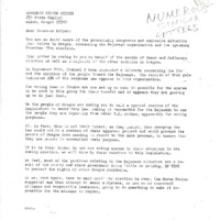 A letter from Reata A. Horney of Concerned Oregon Citizens to Governor Atiyeh. She writes about the upcoming election and the rising tensions related to the Rajneesh crisis. The organization encourages the Governor to rewrite the law that would allow for the Rajneesh to abuse the system, warning that there may be an outbreak of violence amongst the groups. This item was a part of the papers of Bob Oliver, Governor Atiyeh's legal counsel.