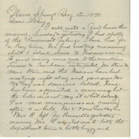A letter from Warm Springs Indian Agency employee Cyrus Walker to his wife, Mary Wheeler Walker. The letter describes Sabbath "meetings" (i.e. church services) with Natives from the Warm Springs Agency; missionaries at Warm Springs; taking the census of tribal members at Simnasho; missing Mary and their son, Clifford; and Warm Springs school business.