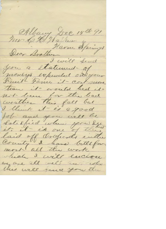 Letter from Frank Wheeler to Cyrus Walker relaying the successful planting of Walker's orchard and a list of the costs