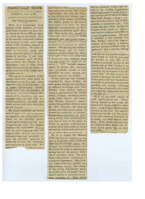 Our Trip to the Agency news article in the Prineville News on the daily workings of the Warms Springs Indian Agency