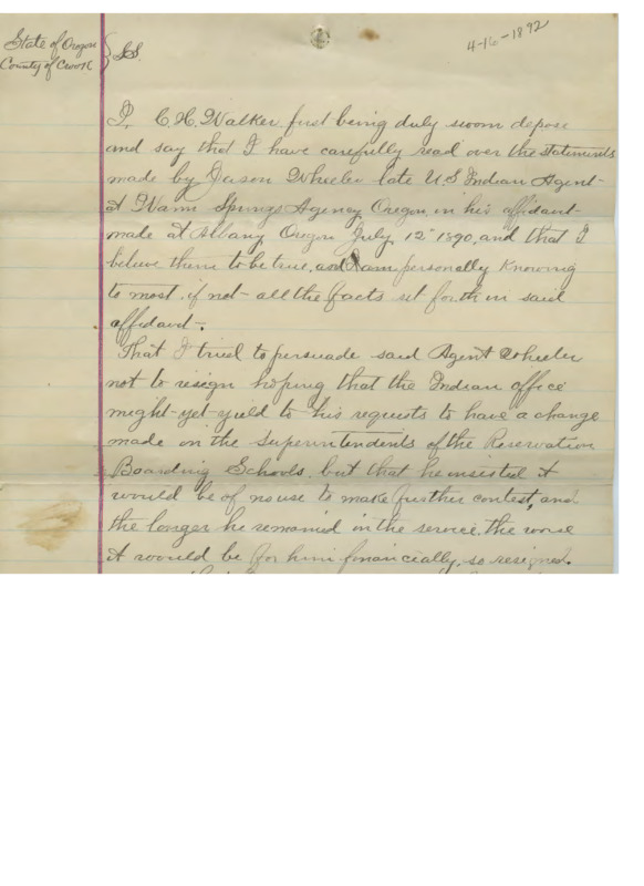 Sworn statement made by Cyrus Walker to Indian Agent J.C. Luckey as a witness in a dispute involving Jason Wheeler at Warm Springs