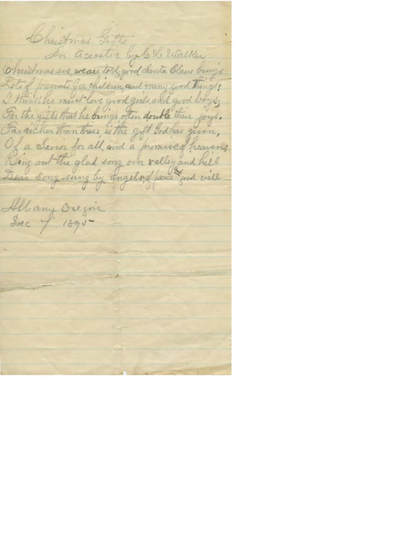 Cyrus Walker was the oldest son of the early Oregon Territory missionaries Elkanah and Mary Richardson Walker. He grew up at Tshimakain in the 1830s-40s, where he learned the native Spokane language. After joining the U.S. army during the Civil War and then attempting to make a living as a farmer, he became a teacher at the Warm Springs Indian Agency. These letters, documents and clippings shed light on his experiences as a missionary, a soldier, a pioneer and a teacher at Warm Springs. This collection was donated to Pacific University by Betty Thorne, a descendant of the Walkers.