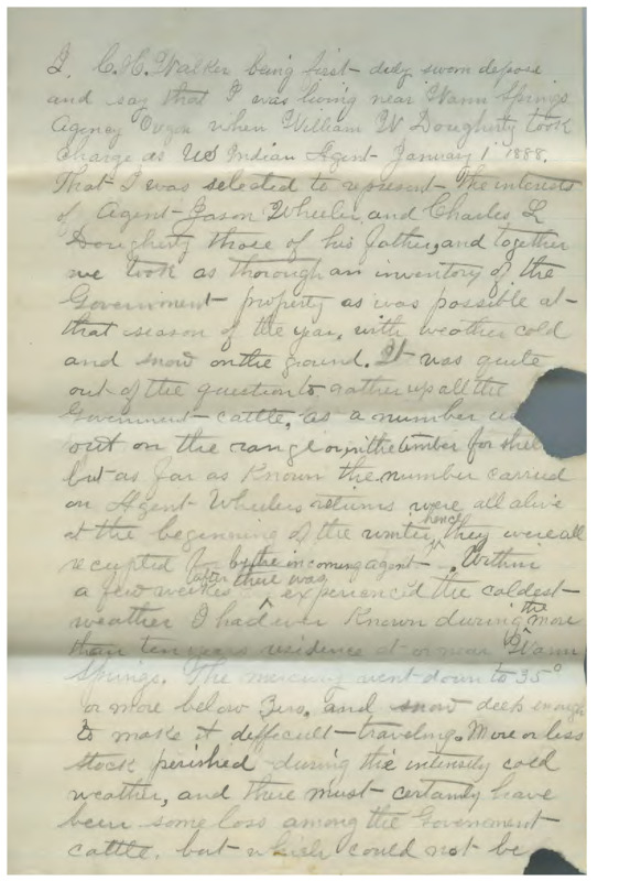 1895 sworn statement by Cyrus Walker defending Indian Agent William W. Dougherty, recounting finances and work at Warm Springs