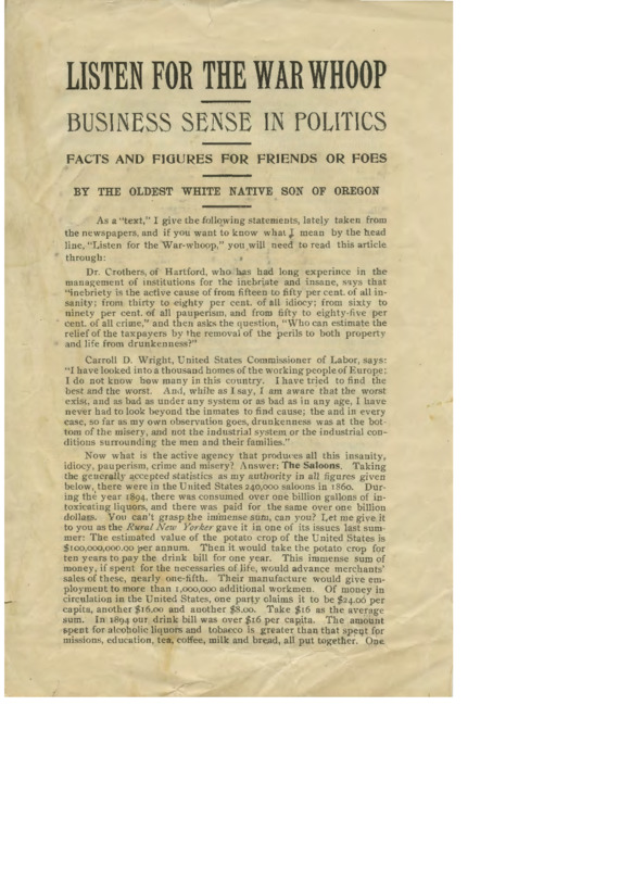 'Listen for the War Whoop' article by Cyrus Walker promoting temperance