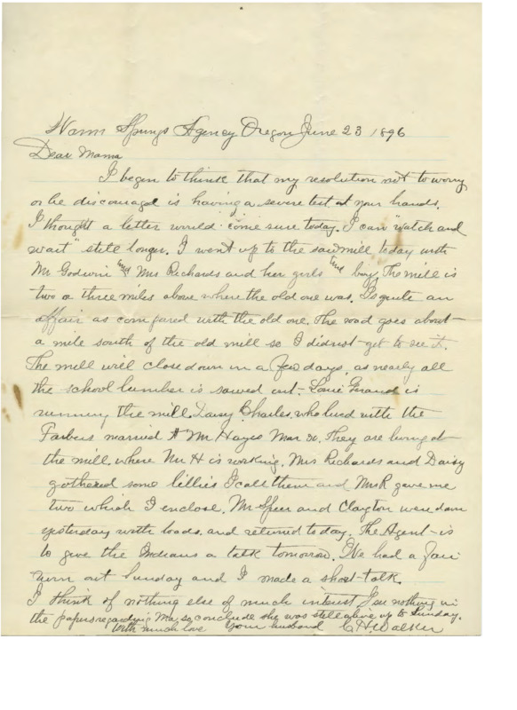 Cyrus Walker was the oldest son of the early Oregon Territory missionaries Elkanah and Mary Richardson Walker. He grew up at Tshimakain in the 1830s-40s, where he learned the native Spokane language. After joining the U.S. army during the Civil War and then attempting to make a living as a farmer, he became a teacher at the Warm Springs Indian Agency. These letters, documents and clippings shed light on his experiences as a missionary, a soldier, a pioneer and a teacher at Warm Springs. This collection was donated to Pacific University by Betty Thorne, a descendant of the Walkers.