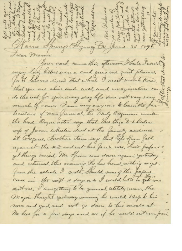 Letter from Cyrus Walker to his wife about her mother's funeral and several injuries at Warm Springs