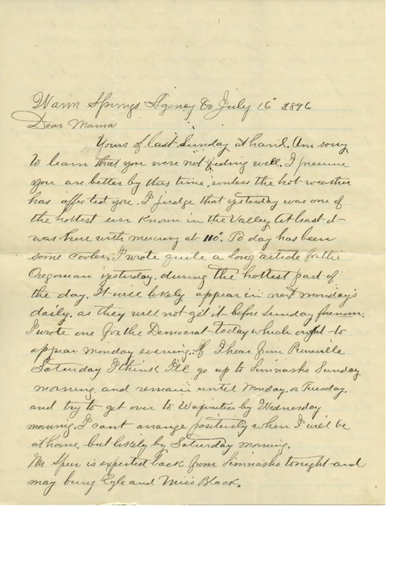Cyrus Walker was the oldest son of the early Oregon Territory missionaries Elkanah and Mary Richardson Walker. He grew up at Tshimakain in the 1830s-40s, where he learned the native Spokane language. After joining the U.S. army during the Civil War and then attempting to make a living as a farmer, he became a teacher at the Warm Springs Indian Agency. These letters, documents and clippings shed light on his experiences as a missionary, a soldier, a pioneer and a teacher at Warm Springs. This collection was donated to Pacific University by Betty Thorne, a descendant of the Walkers.