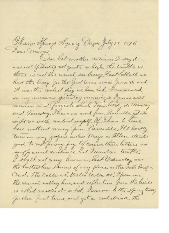 Cyrus Walker was the oldest son of the early Oregon Territory missionaries Elkanah and Mary Richardson Walker. He grew up at Tshimakain in the 1830s-40s, where he learned the native Spokane language. After joining the U.S. army during the Civil War and then attempting to make a living as a farmer, he became a teacher at the Warm Springs Indian Agency. These letters, documents and clippings shed light on his experiences as a missionary, a soldier, a pioneer and a teacher at Warm Springs. This collection was donated to Pacific University by Betty Thorne, a descendant of the Walkers.