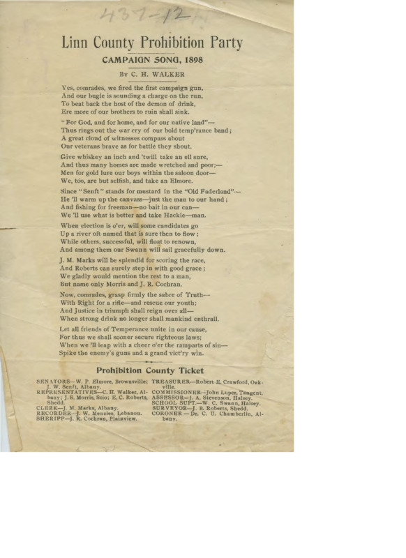 Campaign song written by Cyrus Walker for the Linn County Prohibition Party