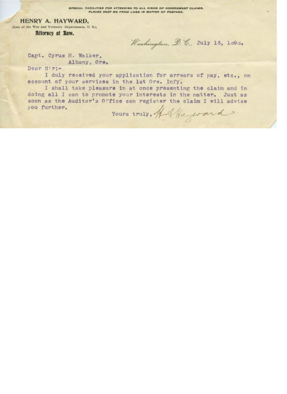 Letter from attorney Henry Hayward to Cyrus Walker upon receiving his application to the veteran pension program