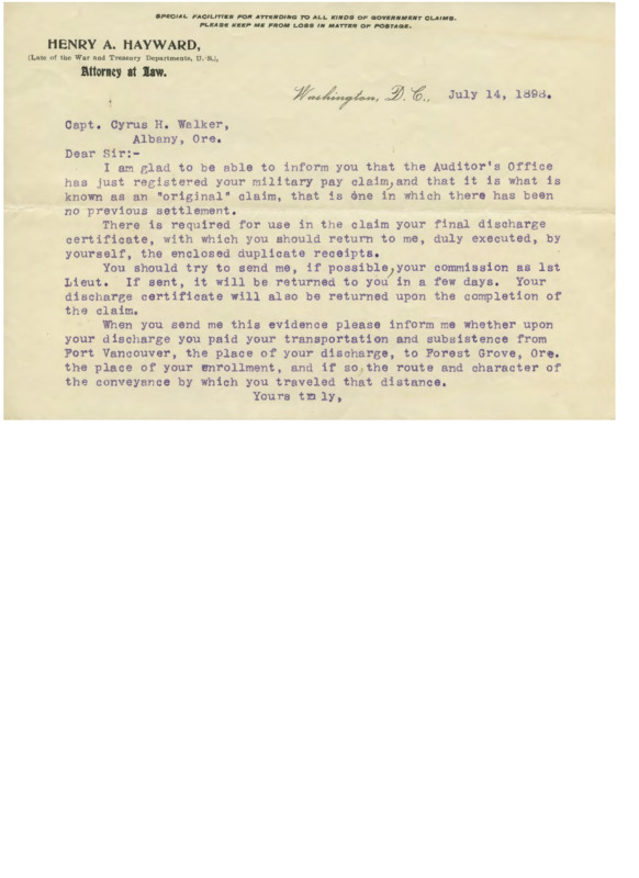 Letter from attorney Henry Hayward to Cyrus Walker on his acceptance into the pension program