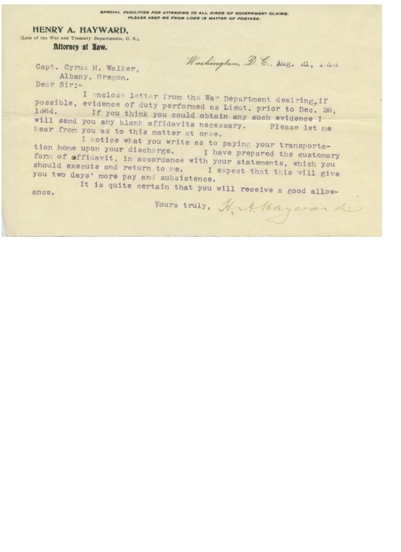 Letter from attorney Henry Hayward regarding Cyrus Walker's military position