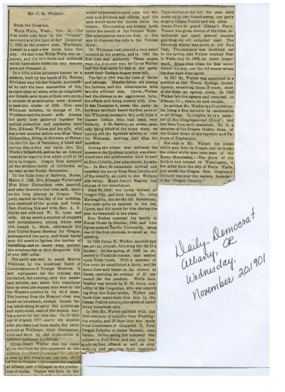 'Mr. C. H. Walker' news article in the Daily Democrat on Cyrus Walker